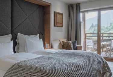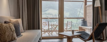 Vom großzügigen Balkon aus und vom Zimmer aus durch die großen Glasfronten überwältigt der Blick über das Tal oder in die Bergwelt/zum Garten. Geölte Holzböden, mit Leinen und Eisen bespannte Wände, ein komfortables Day Bed mit Wollbezug und ein mit Leder bezogener, gemütlicher Schaukelstuhl vollenden das Wohlsein.