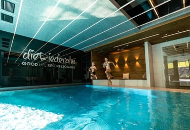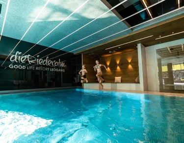Pinzgauer Wasserfestspiele ("Der Bergsee" unser Hallenbad mit Schwimmschleuse zum 20 m Leoganger Sport Outdoor Pool, "Der Wasserfall" Indoor Erlebnis-Wasserrutsche, "Plitsch Platsch" Babybecken, Dress-on-Sauna, verschieden Ruheräume, Sommer-Relax-Wiese).
