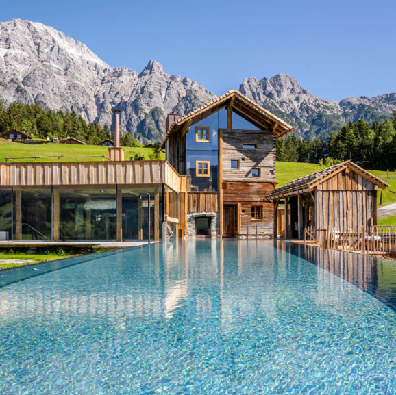 Kaminbecken – 8 x 4 Meter, Indoor Pool mit offenem Kaminfeuer, Naturschwimmbecken – 20 x 4 Meter Bio Pool, Zirbenholz , Troadkastn-Sauna, Original Lappland Rauchsauna-Hütte, Gottfried Kaschnig Salon – Zirbenholz Ruhe Kojen, Infinity Terrasse